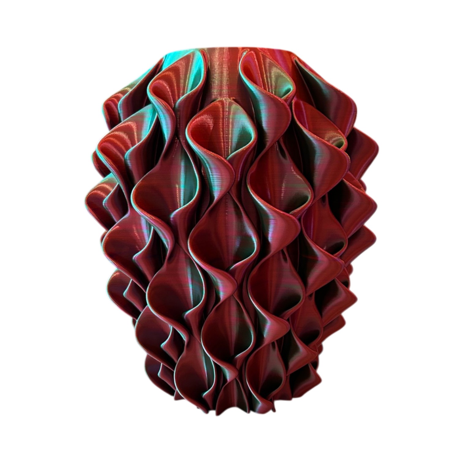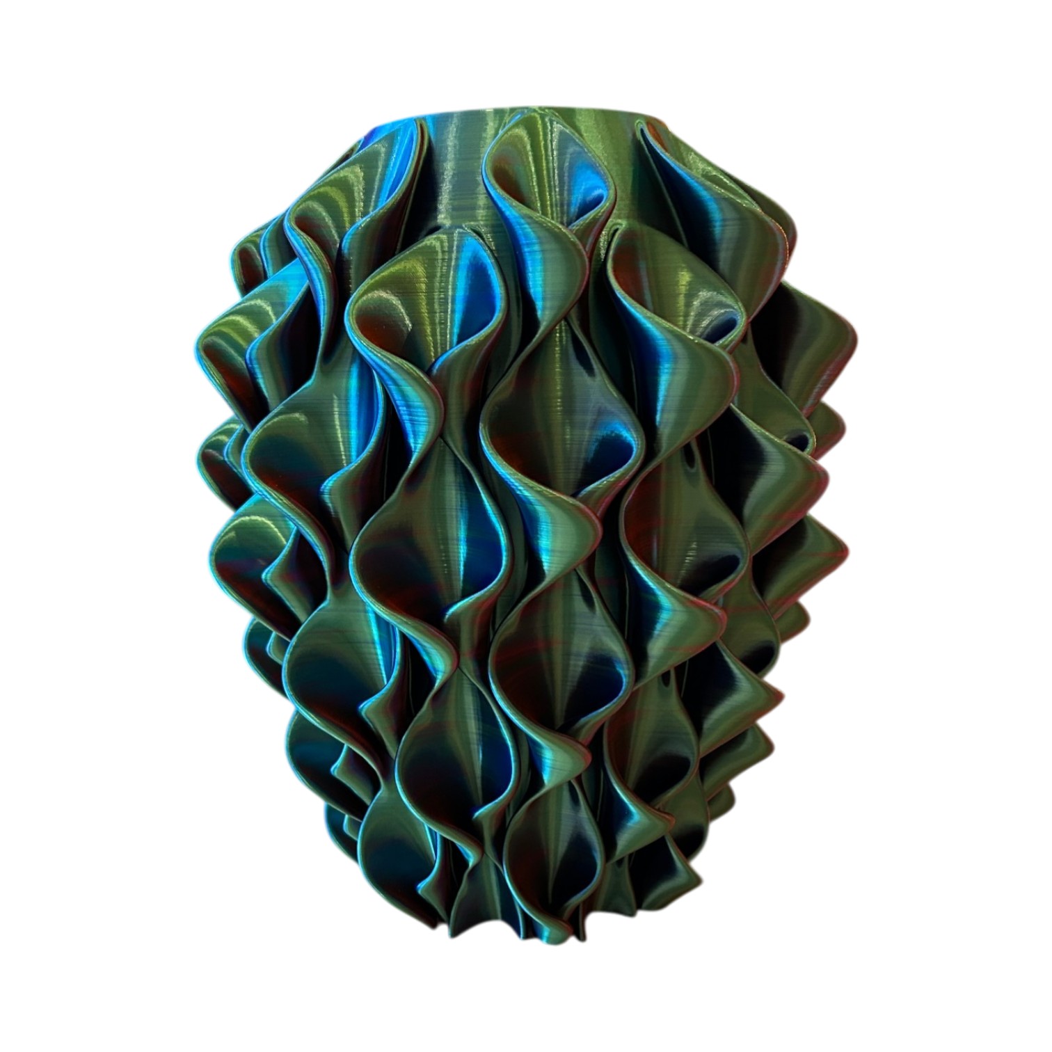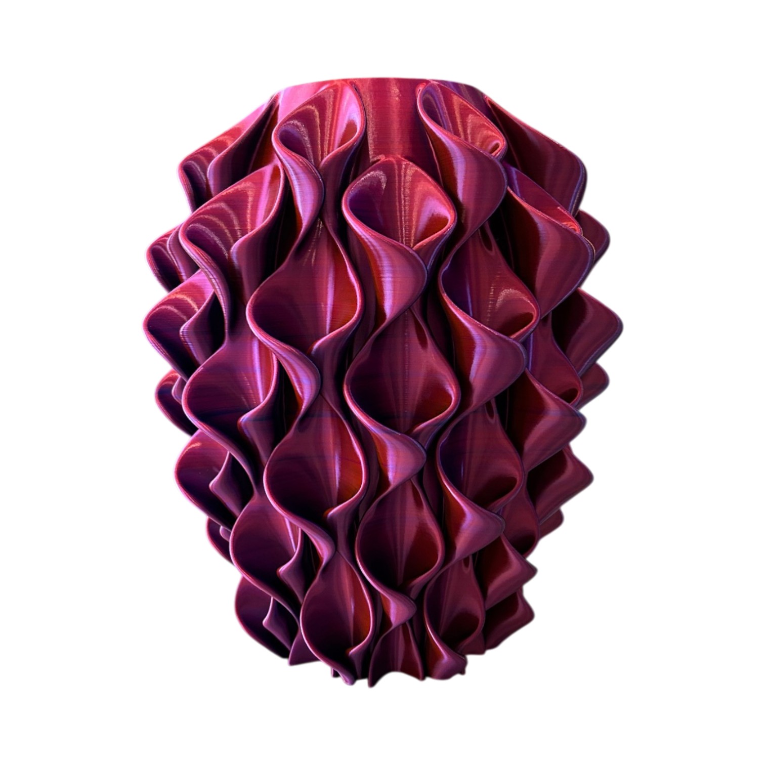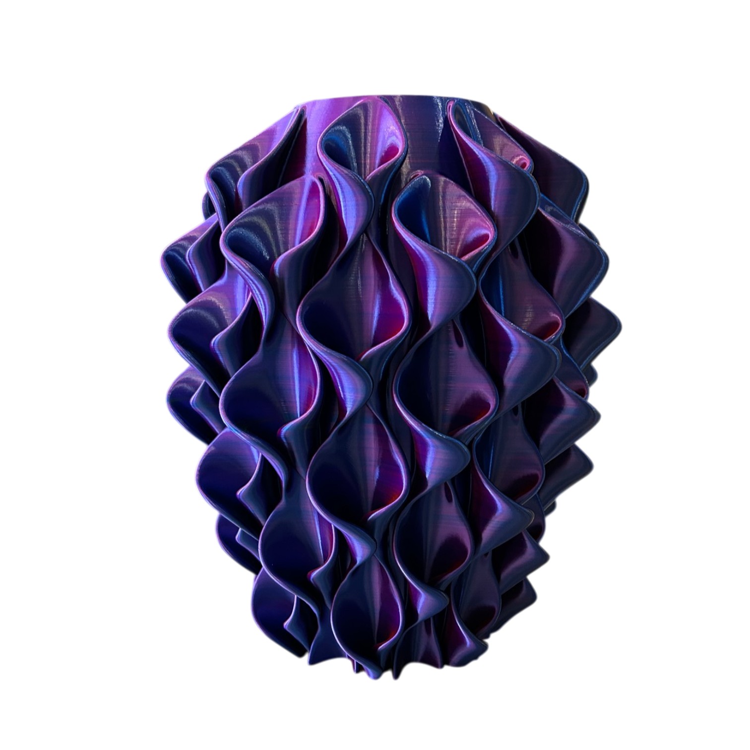 Deze unieke 3D-geprinte vaas is een echte blikvanger in elk interieur. Dankzij het speciale meerkleurige filament veranderd de vaas subtiel van kleur wanneer je haar draait of wanneer het licht erop valt. Vanuit elke hoek ontdek je een nieuwe tint en een ander spel van lijnen, alsof je meerder vazen in een hebt. Het golvende, organische design geeft de vaas een moderne en elegante uitstraling. De vloeiende vormen zorgen voor een speels lichteffect.